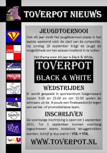 Bijgevoegd vinden jullie de eerste nieuwsbrief over het toernooi en het thema is net als van het zaaltoernooi op zaterdag BLACK & WHITE. Stuur deze nieuwsbrief door naar de trainers/coaches van de jeugdteams en hang het op het prikbord en op de website.