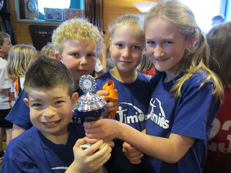 De aller jongste spelertjes van volleybalvereniging Timios uit Boskoop/Waddinxveen zijn afgelopen zaterdag in Gouda gehuldigd wegens het behalen van het Kampioenschap van Niveau 2.