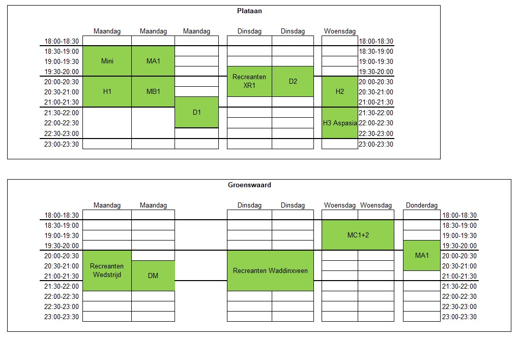 Het schema voor de trainingen ziet er zo uit: