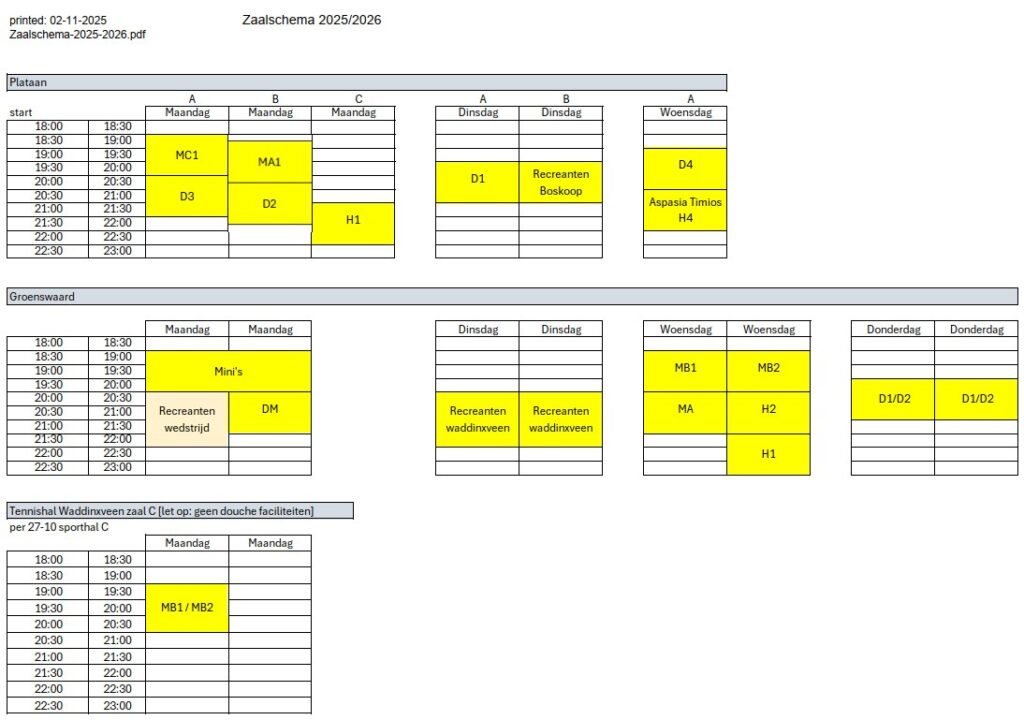 Het zaal- en trainingsschema voor het seizoen 2025-2026: